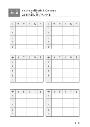 詳しくは「注意事項と免責事項」に記載していますが、 このプリント「繰り上がりのある25マスE」は、「注意事項と免責事項」の範囲内であれば、ご自由に使用することができます。
