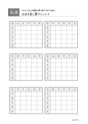 5から9までの数のみを使用した繰り上がりのある足し算の25ます計算版がページ内に6問用意されています。それぞれ違う問題です。繰り上がりのある足し算の復習や100ます計算に挑戦する前にぴったりです。