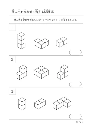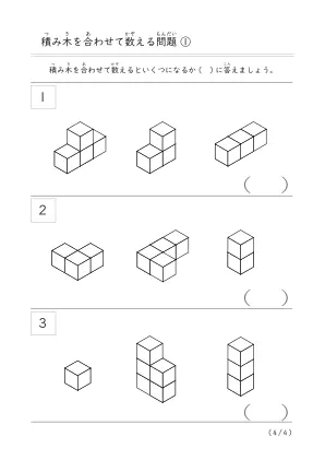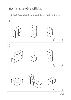 3つある積み木(ブロック)を数えて答えるプリントです。このプリントでは答えは10以下になります。また隠れている積み木がないので数えやすい初級問題になります。図形だけではなく数の概念を学ぶのにもぴったりなプリントになっています。