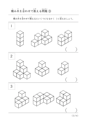 見えないところにも積み木を「想像する力」を使って正確に数える事ができるかどうかがポイントです。慣れると大きくなってからも役立つ立体的な空間認識能力が高まるので頑張りましょう♪