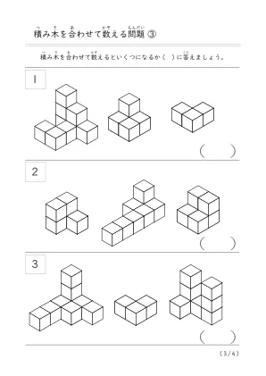 詳しくは「注意事項と免責事項」に記載していますが、 このプリント「積み木を合わせて数える問題③」は、「注意事項と免責事項」の範囲内であれば、ご自由に使用することができます。