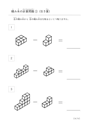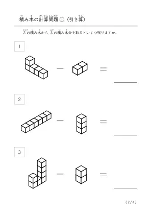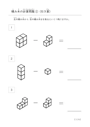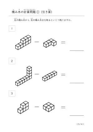 詳しくは「注意事項と免責事項」に記載していますが、 このプリント「積み木(引き算)①」は、「注意事項と免責事項」の範囲内であれば、ご自由に使用することができます。