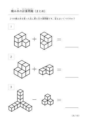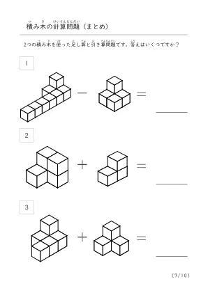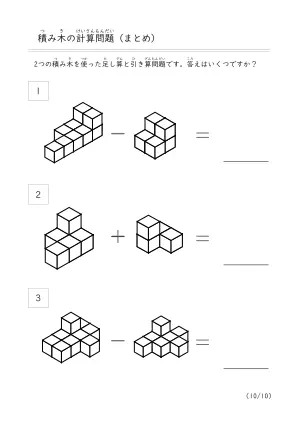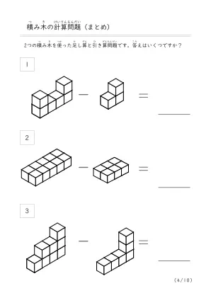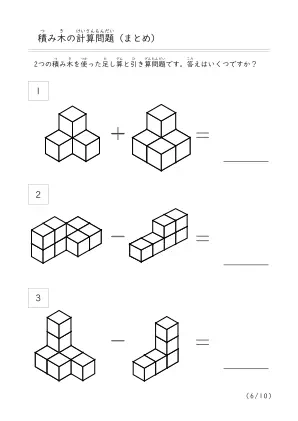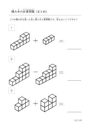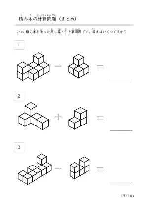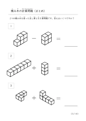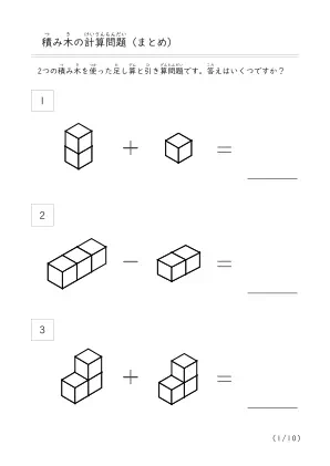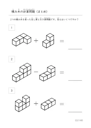 プリント概要積み木を使った「まとめ計算問題」になります。でてくる積み木数は10個以下で足し算と引き算がランダムに混在しているプリントになっています。途中5ページ目から陰に隠れた積み木も出現し難易度が高くなります。数字を使った計算の前、数字を使った計算が苦手な子に計算のイメージが伝わればと思います。