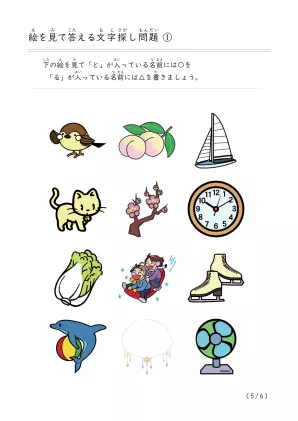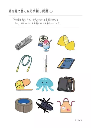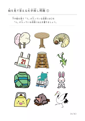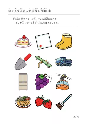 指定された文字(ひらがな・カタカナ)を絵(イラスト)の名前から探しだす問題です。ページ内に12枚の絵(名前)があるのと、答えも複数個あるので丁寧に探していきましょう。