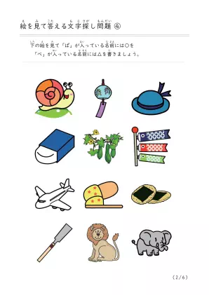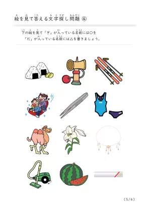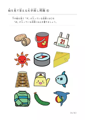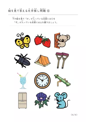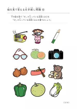 指定された文字(ひらがな・カタカナの濁音や半濁音)を絵(イラスト)の名前から探しだす問題です。ページ内に12枚の絵(名前)があるので丁寧に探していきましょう。
