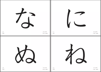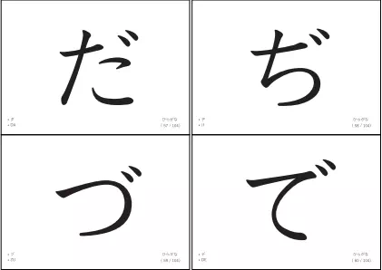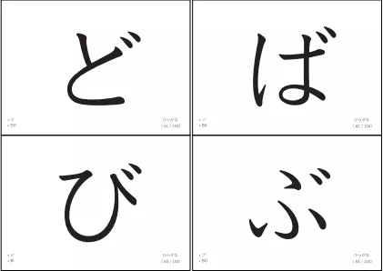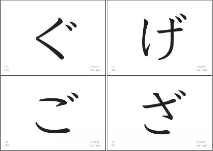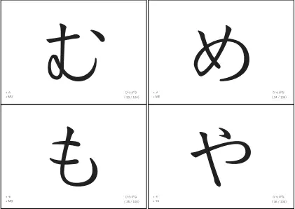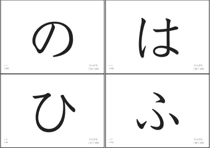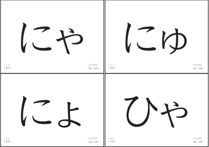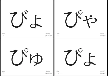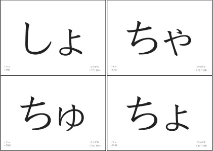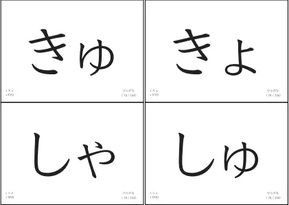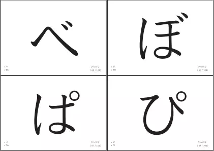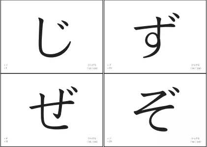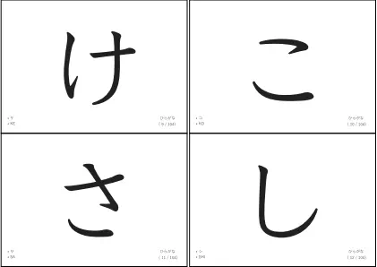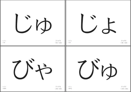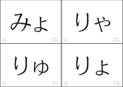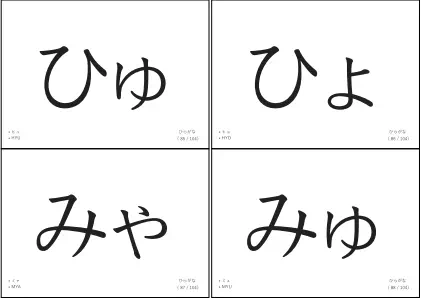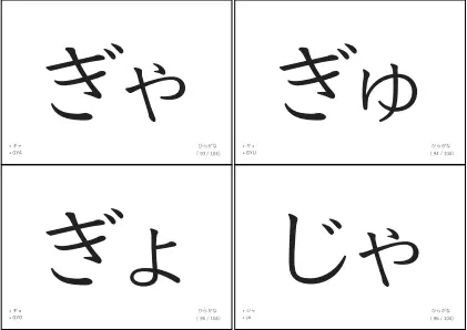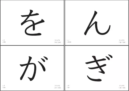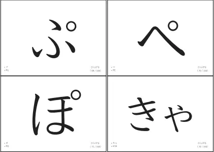 A4サイズにまとめている「あいうえお順」に並んでいるL版サイズの文字版フラッシュカードです。濁音、半濁音、拗音を含んでいるので難易度が少し高めです。この字の読み方かは分かるかな?書けるかな?とと子どもに考えてもらうのにも使えるカードです。左下にカタカナとヘボン式ローマ字を書いています。