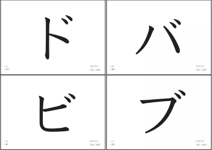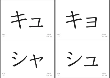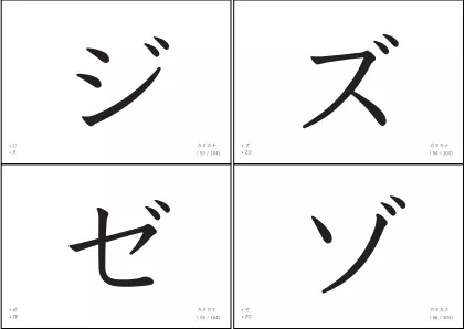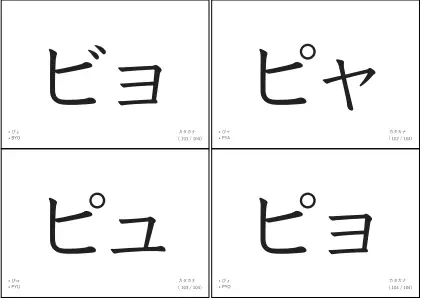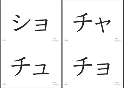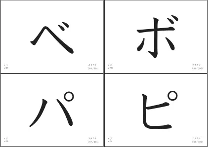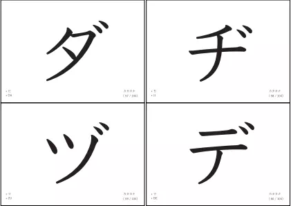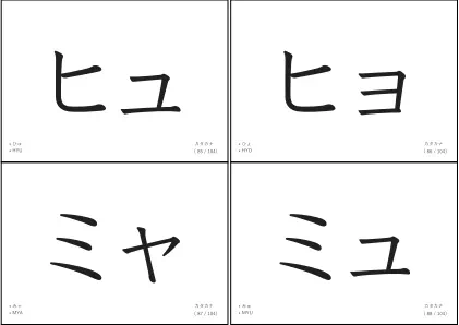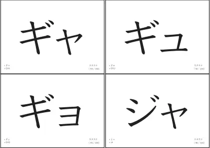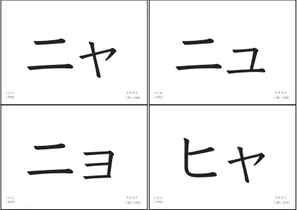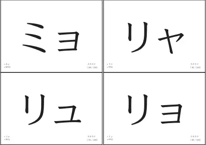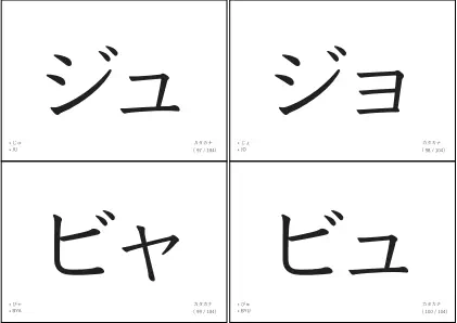 A4サイズにまとめている「アイウエオ順」に並んでいるL版サイズの文字版フラッシュカードです。濁音、半濁音、拗音を含んでいるので難易度が少し高めです。この字の読み方かは分かるかな?書けるかな?とと子どもに考えてもらうのにも使えるカードです。左下にカタカナとヘボン式ローマ字を書いています。