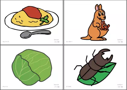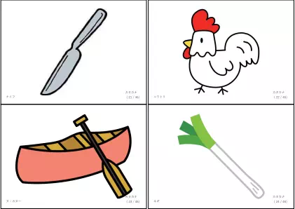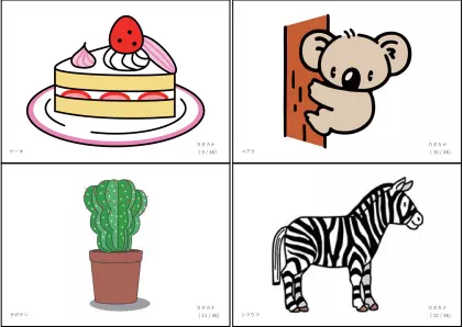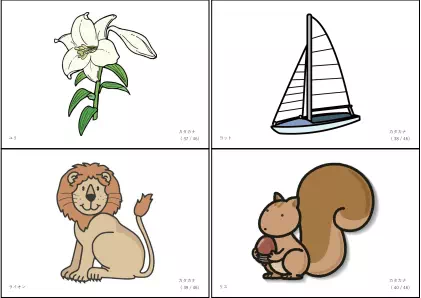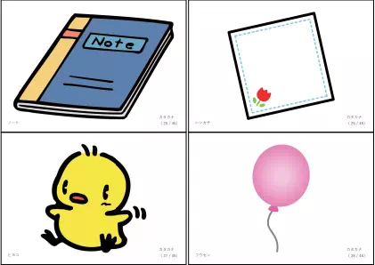 プリント概要A4サイズにまとめた、アイウエオ順に並んでいるL版サイズの文字版フラッシュカードで絵を見て名前は何かな?と子どもに考えてもらうのにも使えるカードです。カタカナで答えるイラストを集めています。