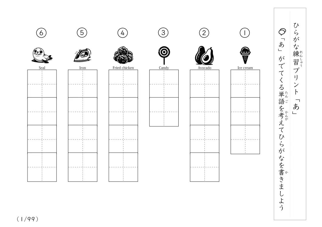「あ」から「ん」まで各ひらがなを使った単語で練習できるひらがななぞり書きプリントです。練習したひらがなを重点的に練習できるのが魅力