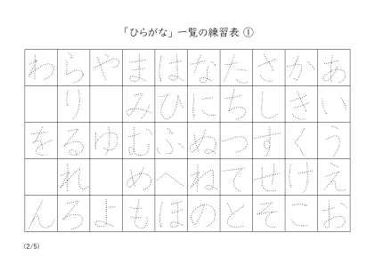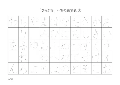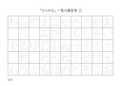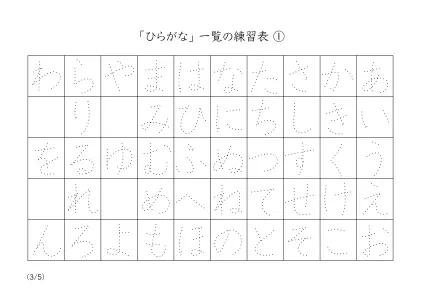 点点のひらがなで作られたA4(横)の「ひらがな一覧表」です。他とは違って点点の上からなぞる事によって完成します。点々の間隔が狭い1ページ目から広い5ページ目まで目的に合わせた点々間隔のプリントを選ぶことができます。狭い方がキレイになぞりやすいです。