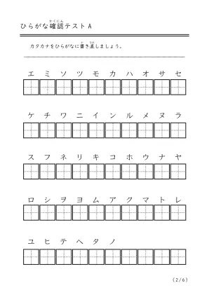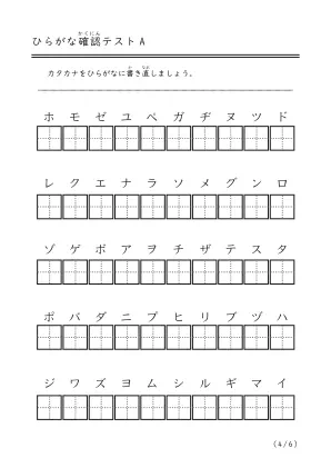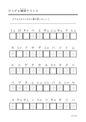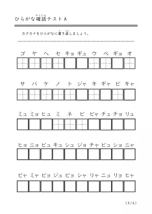 プリント概要カタカナをひらがなにする確認問題です。カタカナからひらがなにちゃんと書き換えられるかなと確認したい子向けのテストです。1ページ目はアイウエオ順に並んでいますが、2ページ目からはバラバラになります。また濁音と半濁音や拗音もでてきます。全部で6ページあります。
