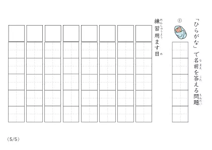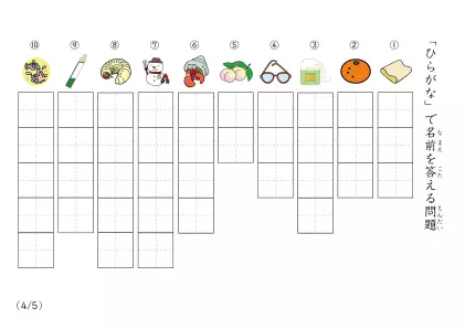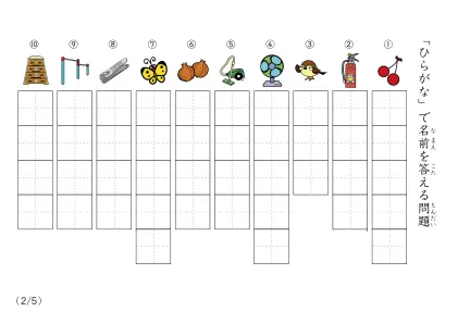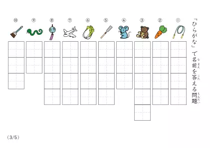 プリント概要絵を見て名前を「ひらがな」で答えるテスト形式の問題です。あいうえお順に並んでいるので何を書くかわかりやすくなっています。ます目があるので枠内に丁寧に書いて答えていきましょう。
