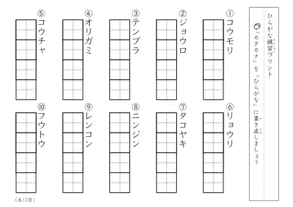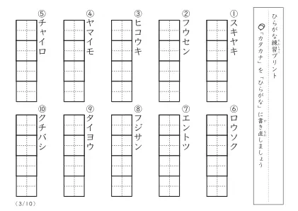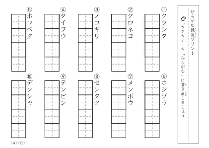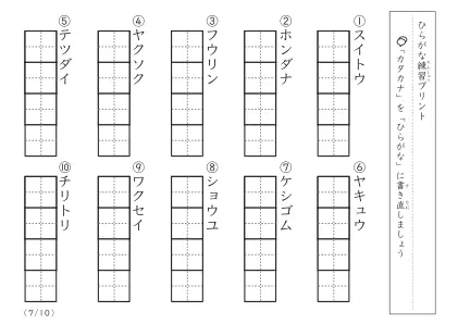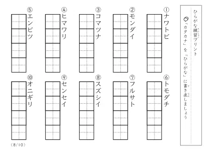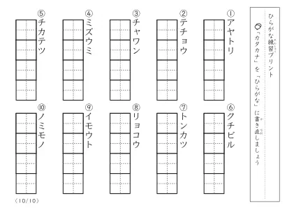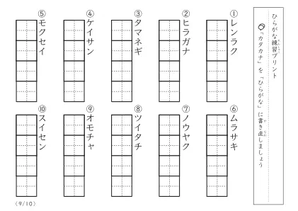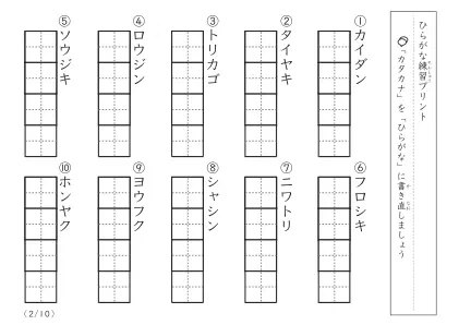 見本の「カタカナ」を「ひらがな」に書き直す「ひらがな練習プリント」です。バランスよくキレイにかける枠を用意しています。問題は100問1ページに10問、10ページあります。