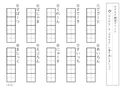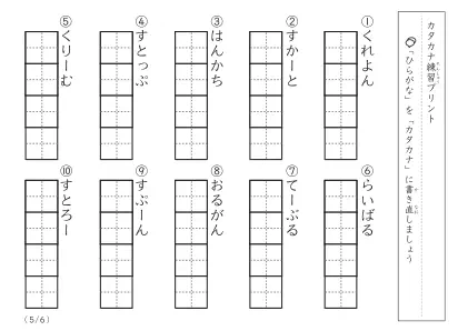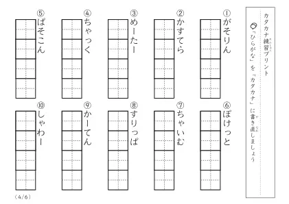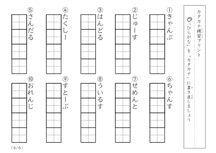 見本の「ひらがな」を「カタカナ」に書き直す「カタカナ練習プリント」です。バランスよくキレイにかける枠を用意しています。問題は60問1ページに10問、6ページあります。