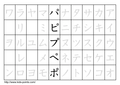 イラストなど無い、シンプルなカタカナ表になります。ポスターのように壁や机に貼ったり、覚えているかの確認や、カタカナを見てどんな単語を思い出せるかゲームなどにも使えます。自分専用のカタカナ一覧表になるようイロイロと装飾してください。