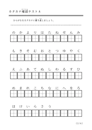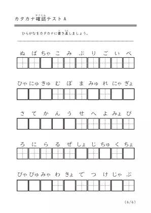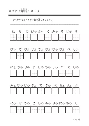 ひらがなをカタカナにする確認問題です。ひらがなからカタカナにちゃんと書き換えられるかなと確認したい子向けのテストです。1ページ目はあいうえお順に並んでいますが、2ページ目からはバラバラになります。また濁音と半濁音や拗音もでてきます。全部で6ページあります。