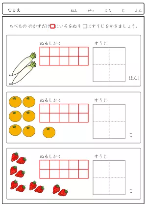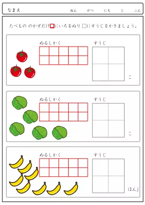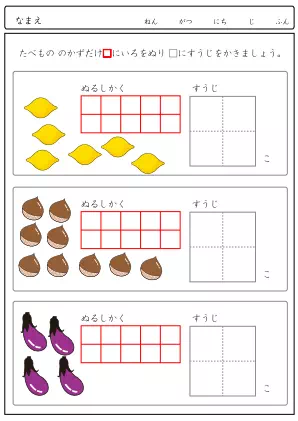 生き物を数えて、同じ数だけます目に色を塗り、最終的に数字を書く問題です。段階をふんで答えるので時間がかかりますが、間違えにく解答方法です。