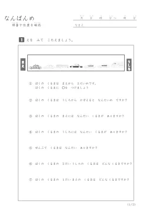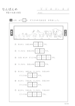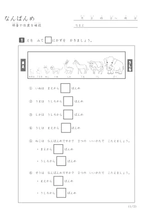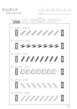 小学1年生で習う算数のプリントです。このプリントでは指定されたイラストの位置や順番を数えて何番目なのかを答えるプリント問題です。シンプルですが間違わないように集中して答えましょう。思い込みで数え始めの位置を間違えないように問題文章をしっかり読みましょう。