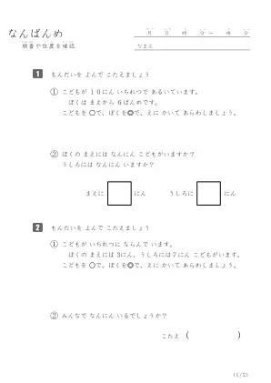 詳しくは「注意事項と免責事項」に記載していますが、 このプリント「なんばんめ問題(B)」は、「注意事項と免責事項」の範囲内であれば、ご自由に使用することができます。