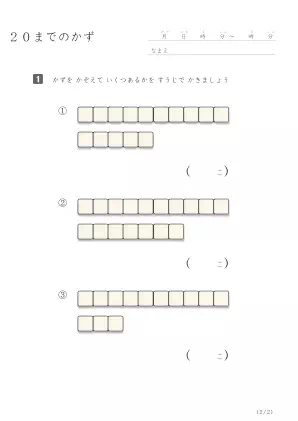 小学1年生で習う算数のプリントです。20までの数を数えて答える問題プリントです。いくつかパターンがありますが、数え間違いが無くなるまで頑張ろう