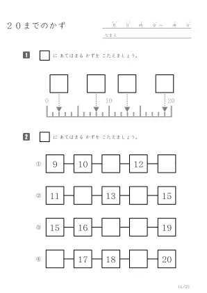 小学1年生で習う算数のプリントです。数字の並びを見て20までの数を数えて答える問題プリントです。いくつかパターンがありますが、数え間違いが無くなるまで頑張ろう