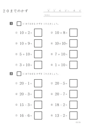 小学1年生で習う算数のプリントです。20までの数の計算問題(足し算と引き算)プリントです。いくつかパターンがありますが、数え間違いが無くなるまで頑張ろう