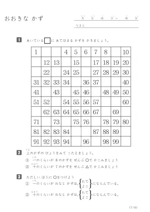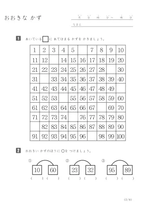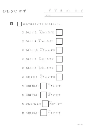 小学1年生で習う算数のプリントです。100までの大きな数のプリント問題。大きな数の実力確認にも使えるまとめ問題にもなります。点数はつけられるようにはなっていませんが、全問正解を目指して頑張りましょう。