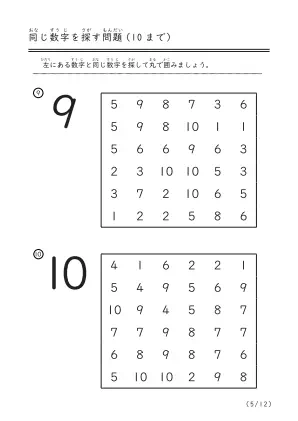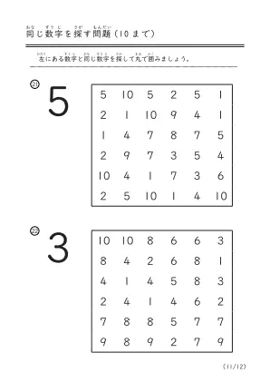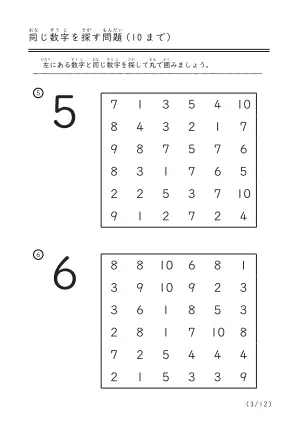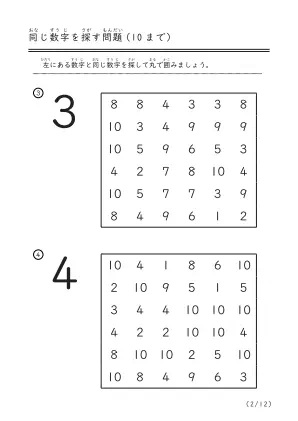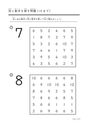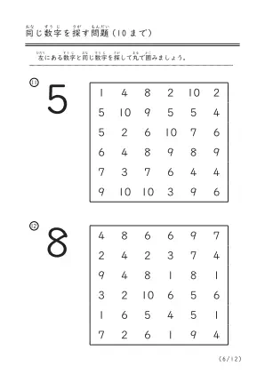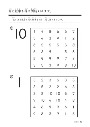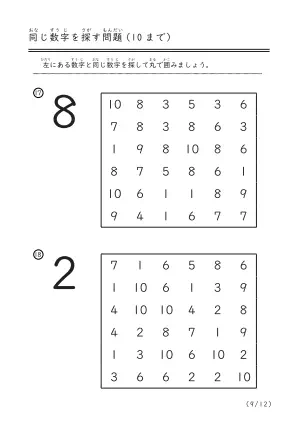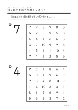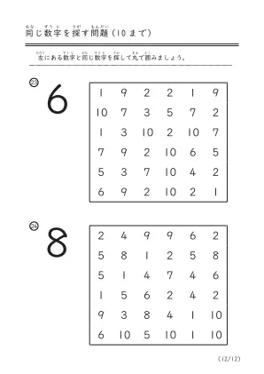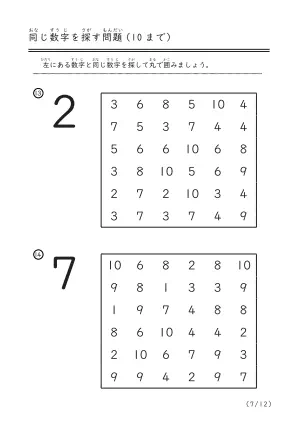 1から10までの数字がランダムに配置されている数字表(36つ)から指定された数を探して丸をつけて答えるPDF形式のプリントです。答えは1つだけでなく複数個あるのでゆっくり探してすべて見つけましょう。