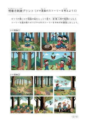 このプリントでは、セリフのないコマ漫画を用意しています。コマ漫画の絵をじっくり見て、あなたが感じたことを元にストーリーを考えてみてください。