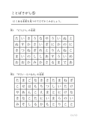 ひらがな表(50文字)の中から12この名前を探して答える「ことばさがし」プリントです。量が多いですが焦らずゆっくり確実に見つけていきましょう。