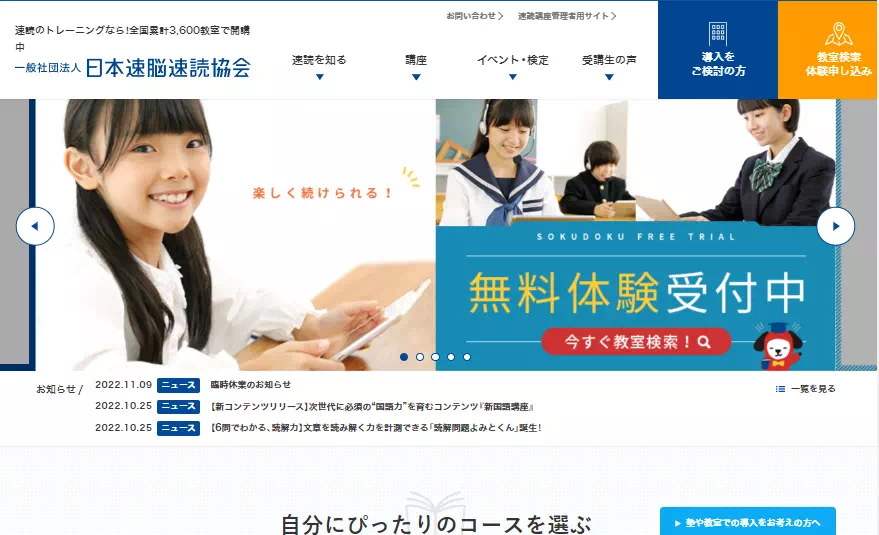 小学生から「速読解力講座」「速読聴英語講座」10級から用意されています。