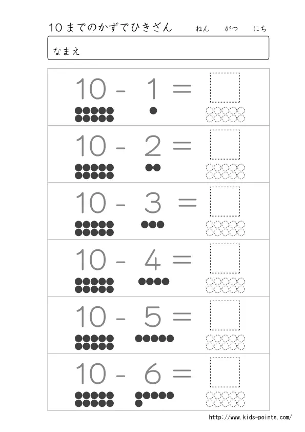 10までの数がでてくる引き算プリント( A4(縦):5 )ページ