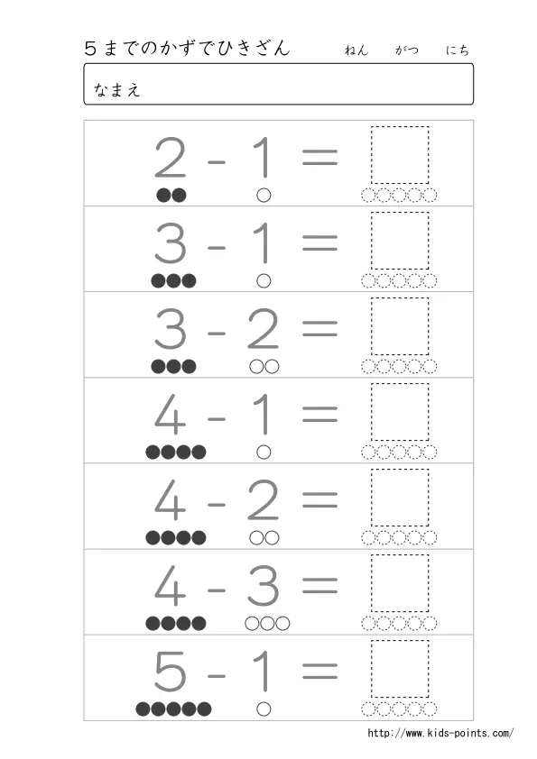 5までの数がでてくる引き算プリント( A4(縦):4 )ページ