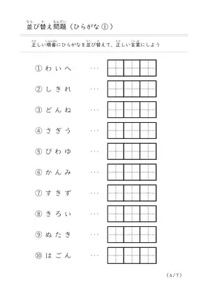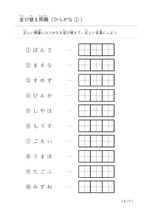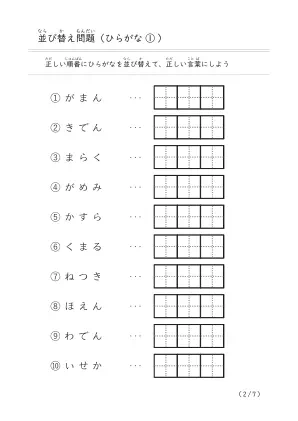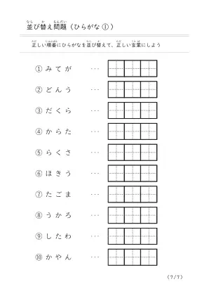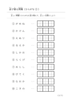 バラバラになっているひらがな3文字を並び替えて正しい言葉を見つけて書く「ひらがなの並び替え問題」です。クイズに挑戦するように楽しくチャレンジしませんか?