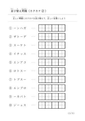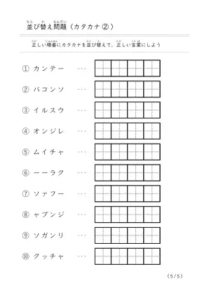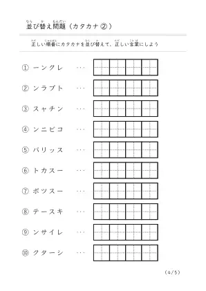 バラバラになっているカタカナ4文字を並び替えて正しい言葉を見つけて書く「カタカナの並び替え問題」です。クイズに挑戦するように楽しくチャレンジしませんか?