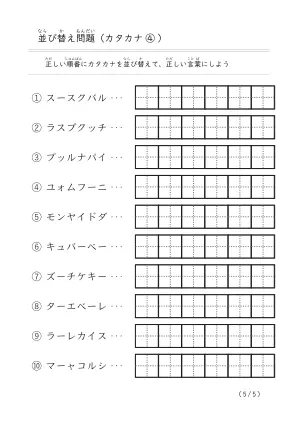 バラバラになっているカタカナ6文字を並び替えて正しい言葉を見つけて書く「カタカナの並び替え問題」です。6文字の並び替えは難しいです。クイズに挑戦するように楽しくチャレンジ