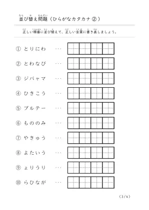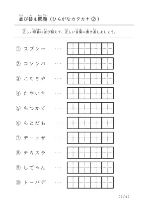 バラバラになっている「ひらがな」か「カタカナ」4文字を並び替えて正しい言葉を見つけて書く「文字の並び替え問題(まとめ)②」です。まとめ問題なのでひらがなとカタカナ言葉が混ざっています。クイズに挑戦するように楽しくチャレンジ