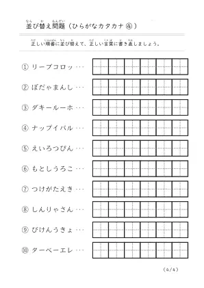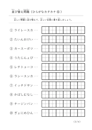ひらがな・カタカナ言葉がでてくる「並び替え問題(まとめ)④」無料ダウンロード