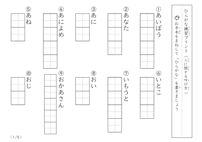 ひらがな(清音)4文字をお手本に「キレイなひらがな」が書けるように練習をする時に使うプリントです。点点文字をなぞってバランスや文字の形を覚えていきます。加えて言葉の意味も覚えていけば役立つこと間違いなしです。