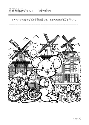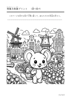 オランダ風車とチューリップの国、オランダへようこそ!鮮やかな花々と静かに回る風車を色付けして、平和で美しい田園風景を楽しもう。