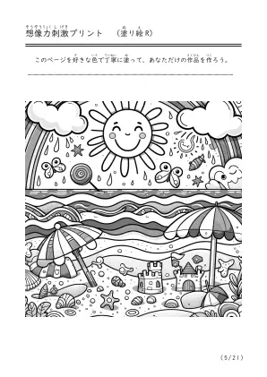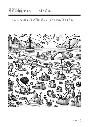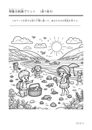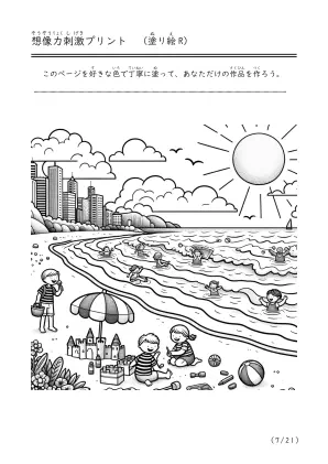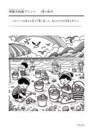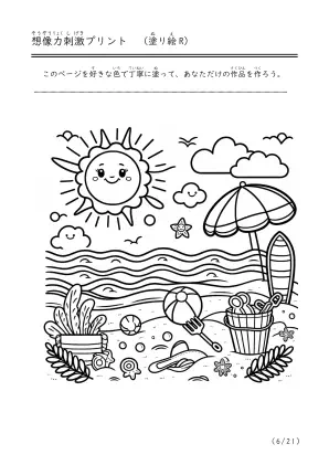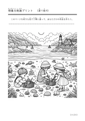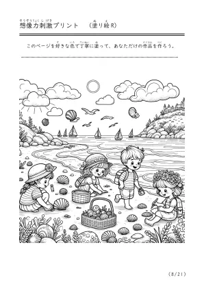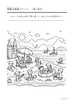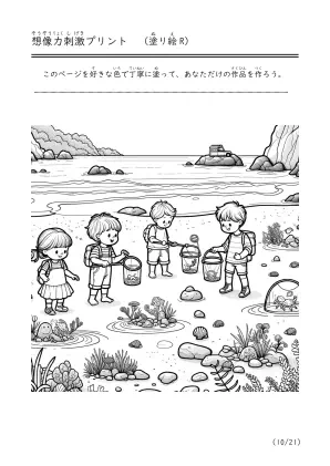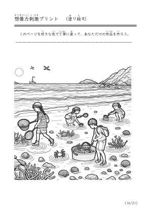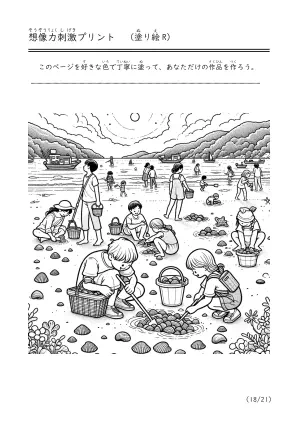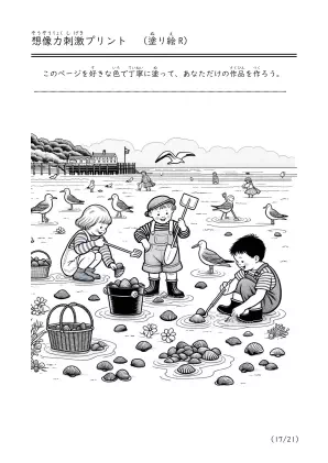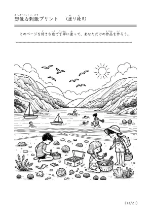 海で遊んでいる様子や潮干狩り、磯遊びをしているシーンを描いた塗り絵
