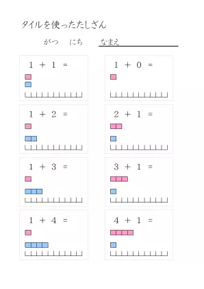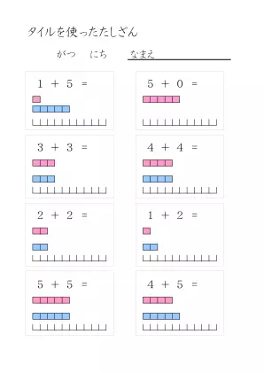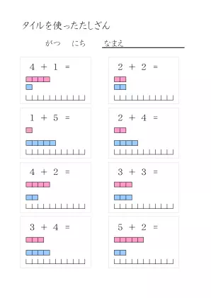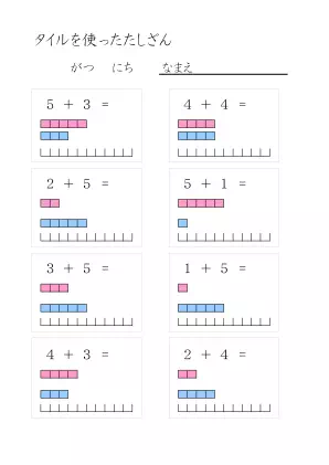 10までの数がでてくる「足し算プリント」です。タイルを使った計算で視覚的に足し算がわかりやすくなっています。最初は指を使うかもしれませんが、だんだん使わなくても計算できるようになります。