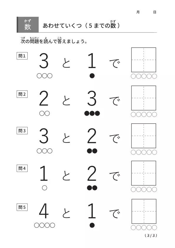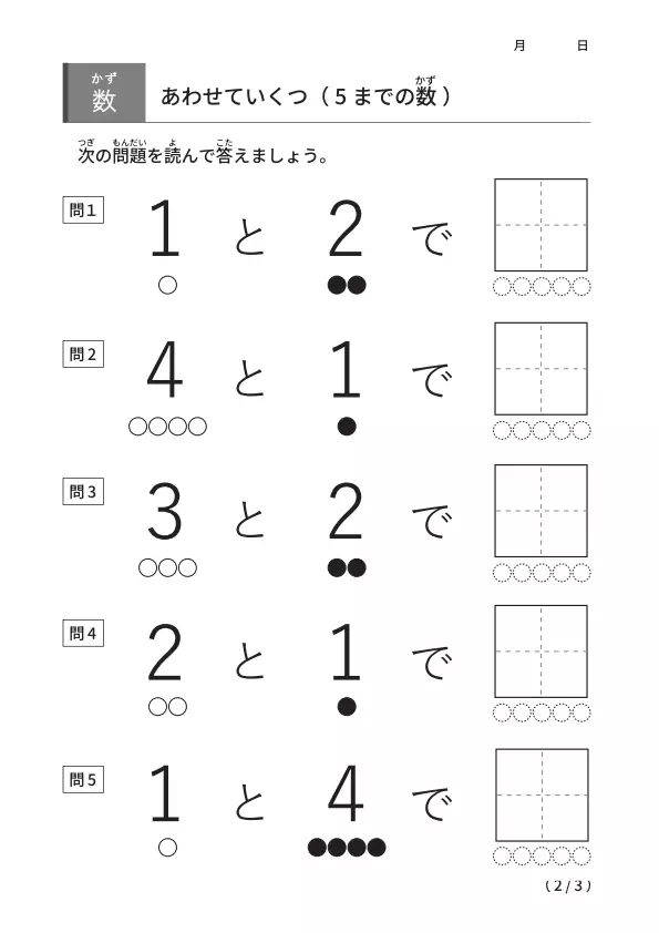 数字と視覚的な要素を組み合わせた2つの数を合わせる問題は数の構成を理解し、数の概念を形成することができます。楽しみながら数のセンスが育ちます。
