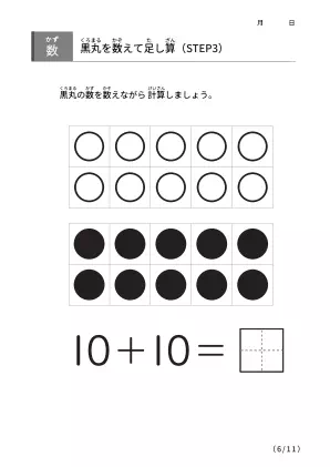 黒丸を数えて合計を求めることで、直感的に20までの足し算の実践が可能です。