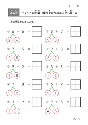繰り上がりのある足し算をわかりやすく計算することができるプリントです。