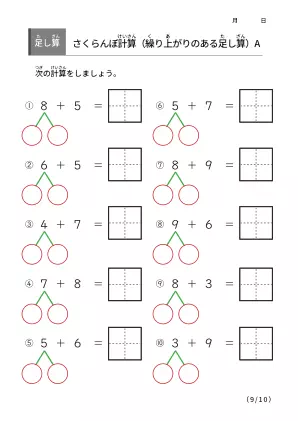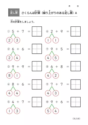 様々な算数学習がある中の「さくらんぼ計算」です。繰り上がりの足し算を学ぶのに最適で数の分解と合成が視覚的にヒントを作り分かりやすくなっているのがポイントです。