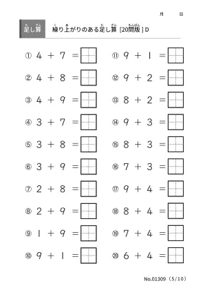 詳しくは「注意事項と免責事項」に記載していますが、 このプリント「繰り上がりのある足し算 D」は、「注意事項と免責事項」の範囲内であれば、ご自由に使用することができます。
