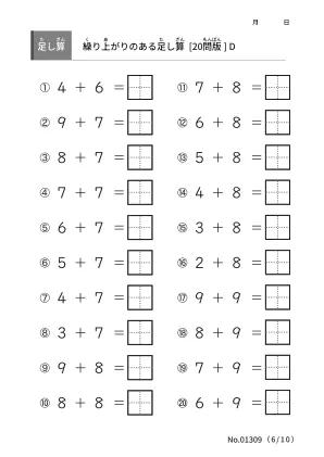 順番に並んでいる「繰り上がりのある足し算 D」無料ダウンロード