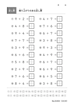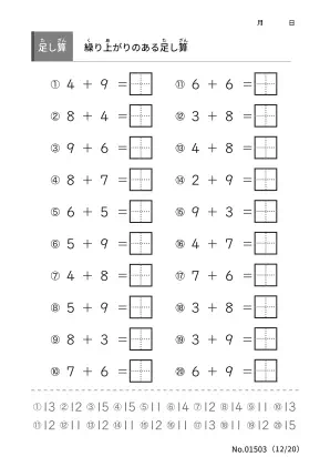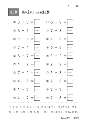 足し算の基本的なスキルを身につけるのに役立つ答えが15までの繰り上がりのある足し算プリントです。
