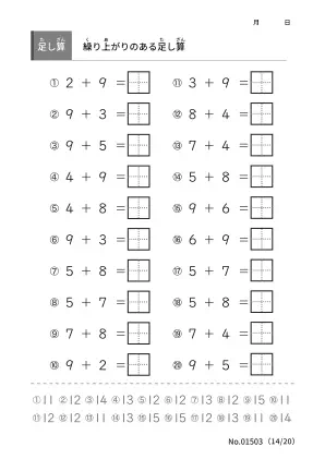 答えが15までの「繰り上がりのある足し算(答え付き)」無料ダウンロード